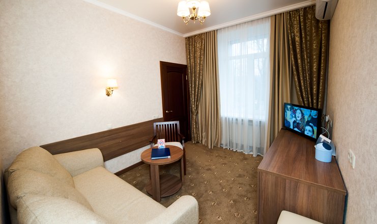 В номере: кровать двуспальная, стол, столик туалетный, стулья, гладильная доска, диван, набор посуды, сейф, сплит-система, телевизор, утюг, холодильник, электрочайник