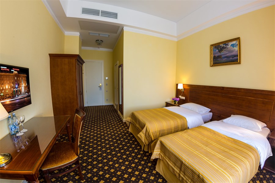 В номере: две полутороспальные кровати, прикроватные тумбы, стол, стул, письменный стол, шкаф для одежды, спутниковое телевидение, телевизор, система климат-контроля, мини-бар, сейф, чайный набор