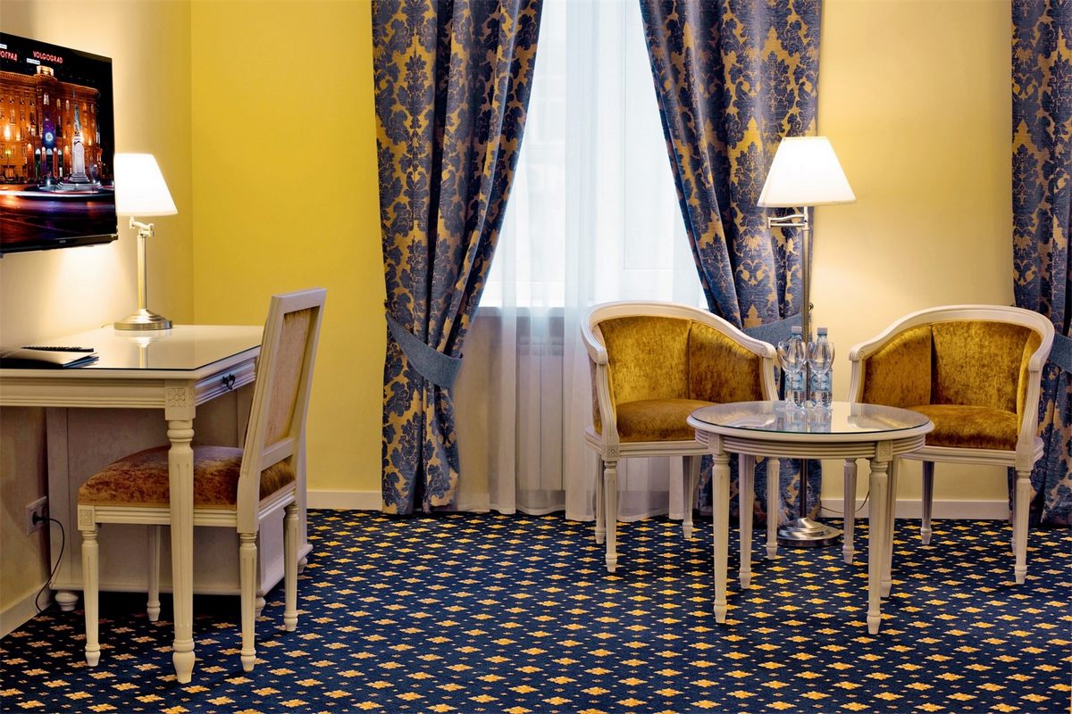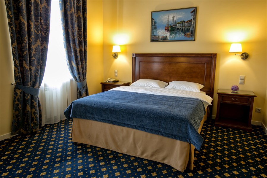 В номере: двуспальная кровать, прикроватные тумбы, стол, стул, письменный стол, шкаф для одежды, спутниковое телевидение, телевизор, система климат-контроля, мини-бар, сейф, чайный набор